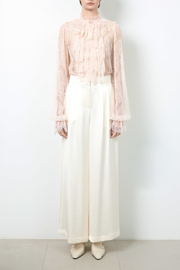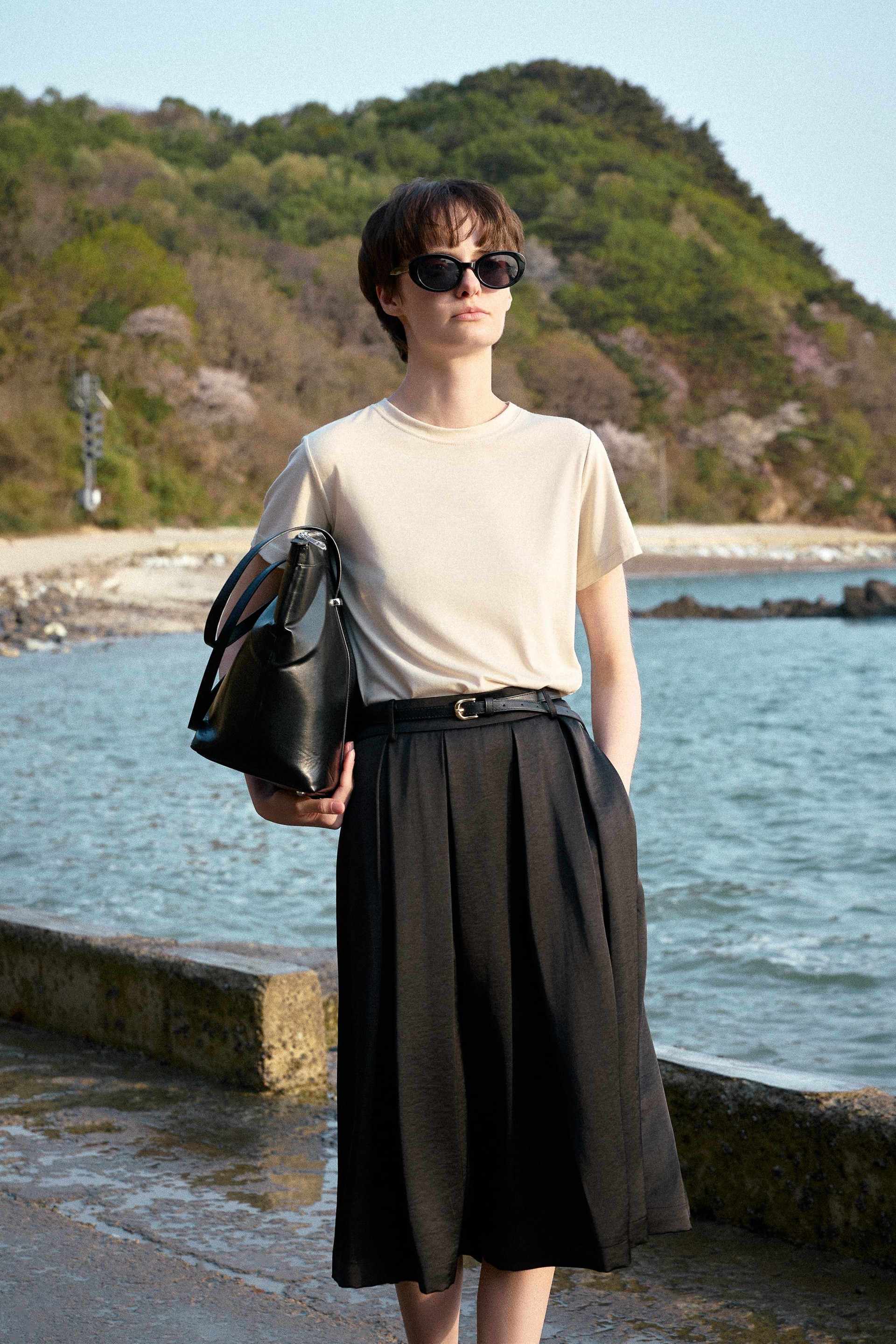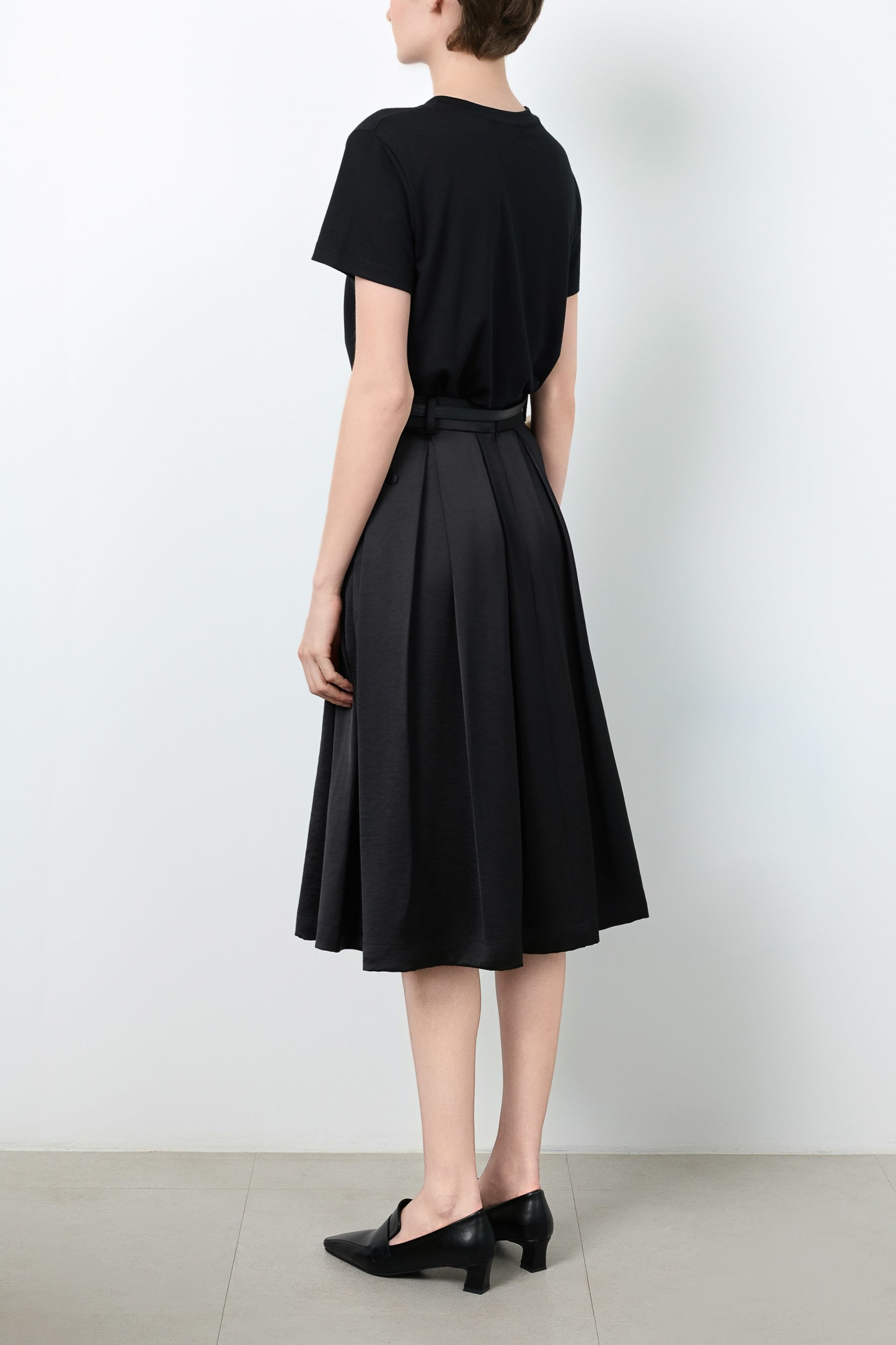 The Belle Skirt featuring box pleats and soft volume in matte rayon satin.
