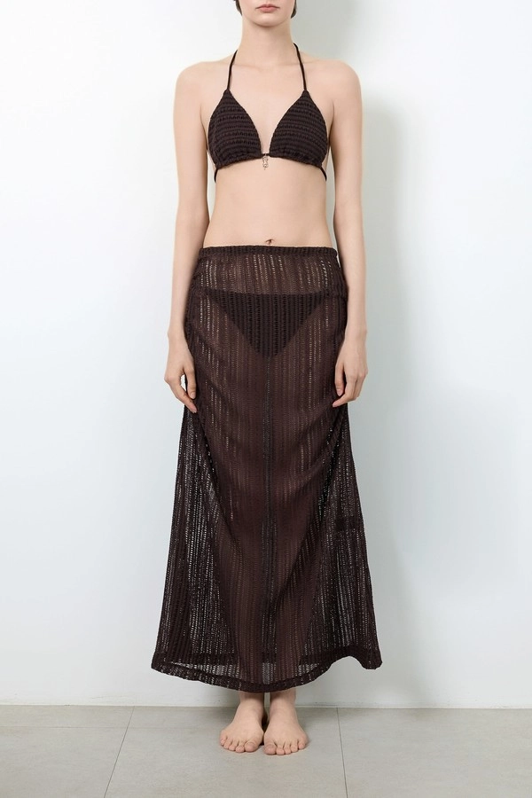 The Carmen Knit Maxi Skirt featuring a textured knit with a soft, handmade feel - evoking an effortless bohemian mood. Style it with the Carmen Bikini for a relaxed yet elevated beach ensemble.